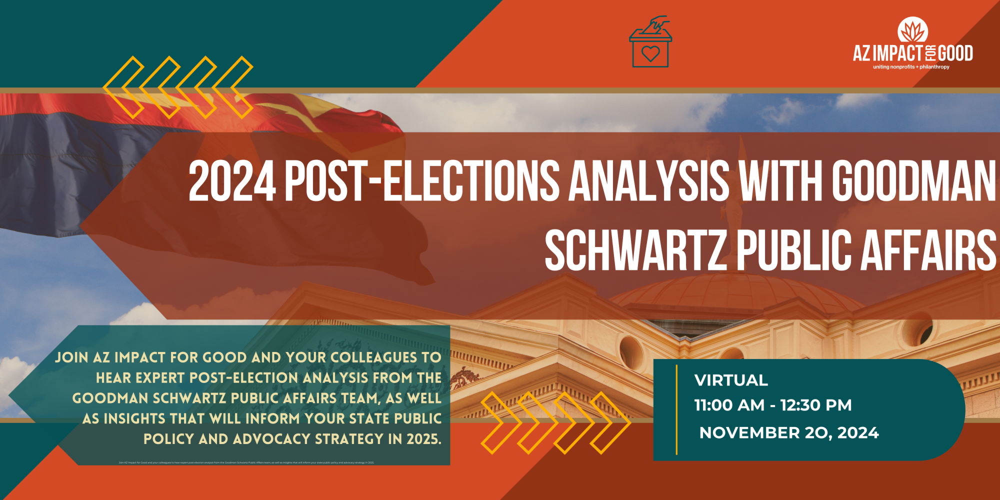 Join AZ Impact for Good and your colleagues to hear expert post-election analysis from the Goodman Schwartz Public Affairs team, as well as insights that will inform your state public policy and advocacy strategy in 2025.