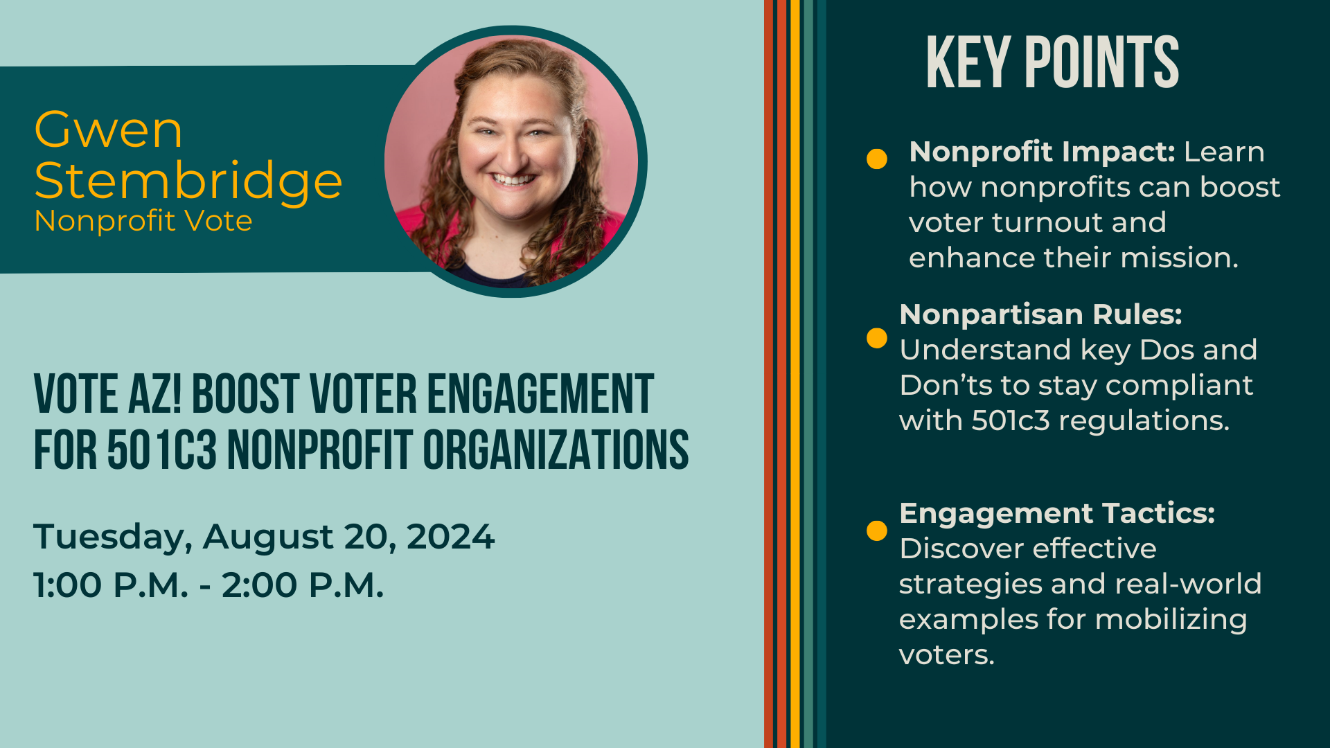 Ready to make your nonprofit's voice heard in the community? Dive into the essentials of voter engagement with our lively and informative session designed for nonprofit leaders, staff, and volunteers. Learn why nonprofits are a powerful force in boosting voter turnout and how you can contribute without stepping into partisan territory. We’ll cover the key strategies to effectively engage voters and ensure your organization’s efforts are both impactful and compliant. Join us for a session filled with actionable insights and real-world examples.