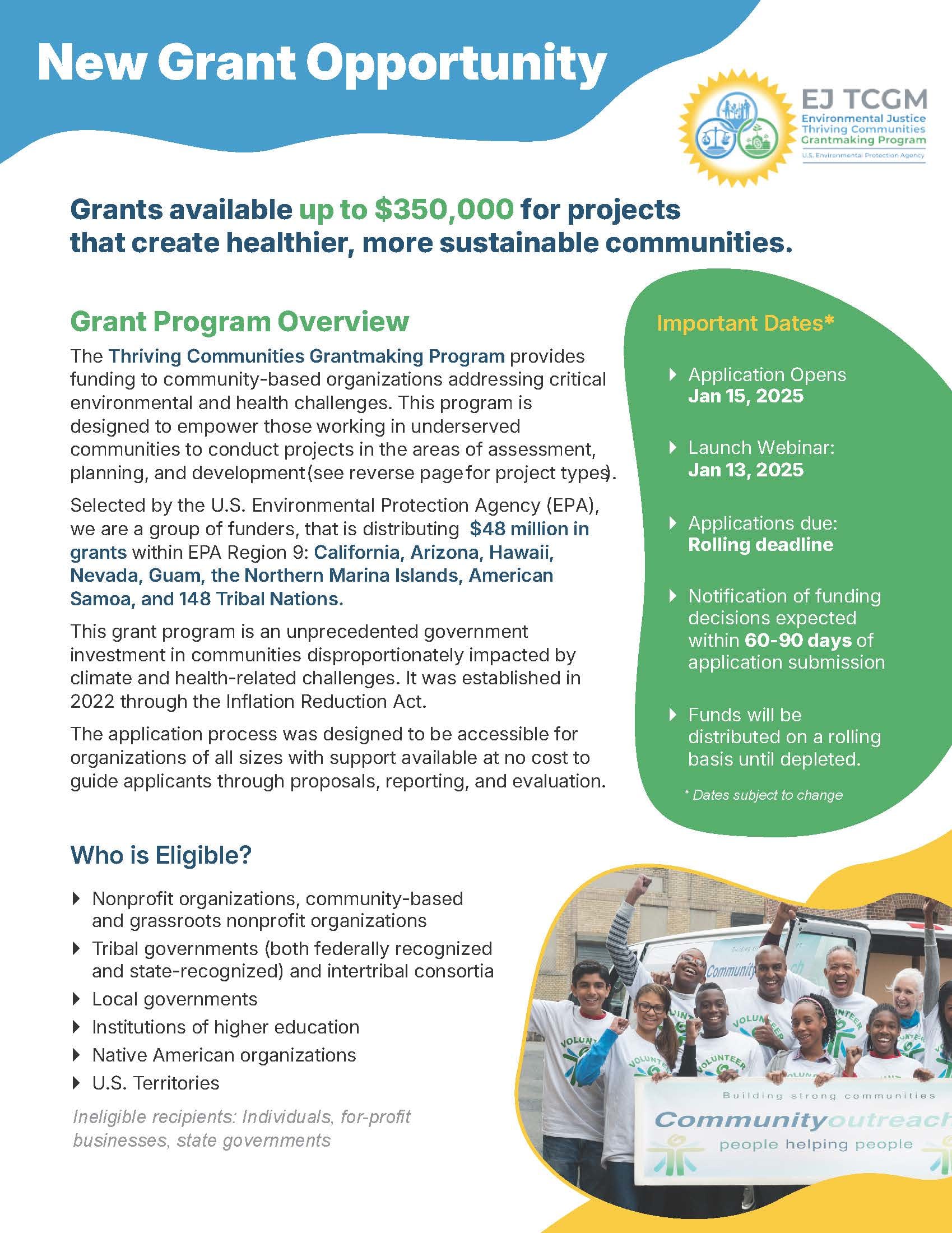We are excited to let you know that on January 15th, the EPA’s Environmental Justice Thriving Communities Grantmaking Program will open for projects located in Arizona. This grant opportunity is designed to empower community-based organizations, Tribes, and local governments, to advance meaningful environmental and resiliency projects in their communities.