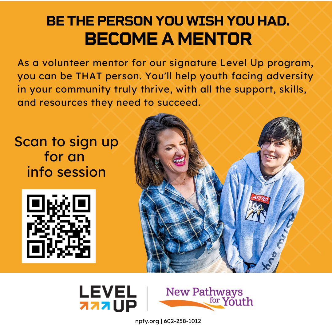 Level Up by New Pathways for Youth works with Phoenix-area high school-aged kids who have experienced high levels of adversity. Youth are matched with a volunteer mentor, who serves as a caring and stable adult in their life and supports them in completing our research-based program for setting and meeting personal goals. Become a mentor today!